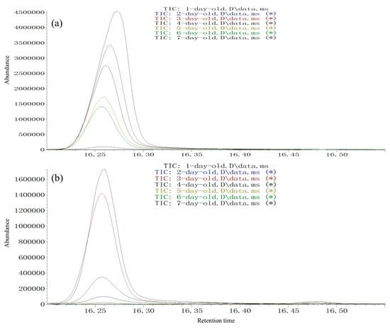 Age-dependent (Z)-3-Decen-1-ol release collected from 11:00–12:00 from 2- to 7-day-old males from Sirex noctilio (a) and Sirex nitobei (b); GC conditions: HP-5 fused-silica column, 40 °C for 2 min, then, 6 °C/min to 180 °C and 15 °C/min to 270 °C. MS conditions: interface temperature, 250 °C; ion source temperature, 250 °C; ionization voltage, 70 eV.