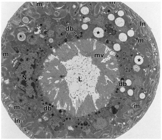 Cross-section through a Malpighian Tubule (MT) of an Aeolothrips intermedius Bagnall, 1934 (Thysanoptera: Aeolothripidae) adult. The epithelial cells show a basal system of membrane infoldings with associated mitochondria. The nucleus occupies the central cell region. In the cytoplasm, there are numerous electron-transparent inclusions, sometimes with concentric layers (asterisks). Electron-dense bodies are visible at the apex of epithelial cells, at the base of microvilli. In the MT lumen are present scattered small electron-dense granules. db = electron-dense bodies, In = membrane infoldings, L = lumen, m = mitochondria, mv = microvilli, N = nucleus. From Conti et al. [5].