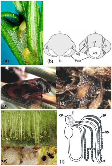 (a) Philaenus spumarius (Linné, 1758) nymphs inside the foam nest. (b) representation of the abdominal morphology of true spittlebugs nymphs during the production of the foam, in correspondence to the first (1) and fourth (2) urite. St = sternum, Stg = stigmas, Para = paratergal lobes around the respiratory cavity (CR). From Conti et al. [5]. (c) Haematoloma dorsata (Ahrens, 1812) adult and (d) nymph in its foam nest. Images courtesy of José María Cobos, Ministerio de Agricultura, Pesca y Alimentación C/Almagro, Madrid, Spain. (e) Callitettix versicolor (Fabricius, 1794) spittle masses produced by the nymphs at the roots of rice (Oryza sativa L. Poaceae) plants. Images courtesy of Ai-Ping Liang and Xu Chen, Institute of Zoology, Chinese Academy of Sciences, Beijing, China. (f) Representation of the gut complex, including the Malpighian Tubules (MTs), of Homoptera Cercopoidea preimaginal instars. CF = filter chamber, SP = proximal segment of the MTs, SD = distal segment of the MTs, R = rectum. From Conti et al. [5].