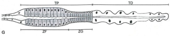 Representation of Machaerotidae nymphs Malpighian Tubules. TP = proximal tract, TD = distal tract, ZF = zone rich in fibrils, ZG = zone rich in granules. From Conti et al. [5].