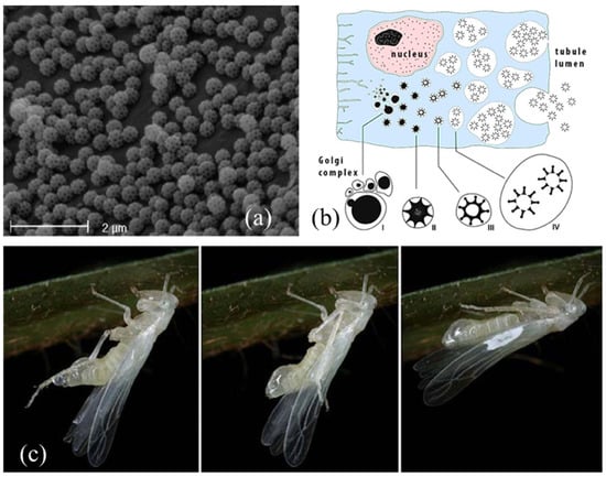 (a) Integumental brochosomes. Image courtesy of Andrea Lucchi, Department of Agriculture, Food and Environment, University of Pisa, Italy. (b) Development of brochosomes through four stages in Golgi-derived vesicles. Image credit: Roman Rakitov, licence CC BY-SA 4.0. ©2016 https://www.wikiwand.com/en/Brochosome#Media/File:Brochosome_secretion_En.jpg. (c) A freshly molted female of Igutettix oculatus (Lindberg, 1929) using hind tibiae to transfer the fluid medium containing brochosomes from the anus (Left) onto the forewings (Center) where it dries in white spots (Right). Images credit: Roman Rakitov, CC BY-SA 3.0. ©2009 https://www.wikiwand.com/en/Brochosome#Media/File:Igutettix_anointing.jpg.