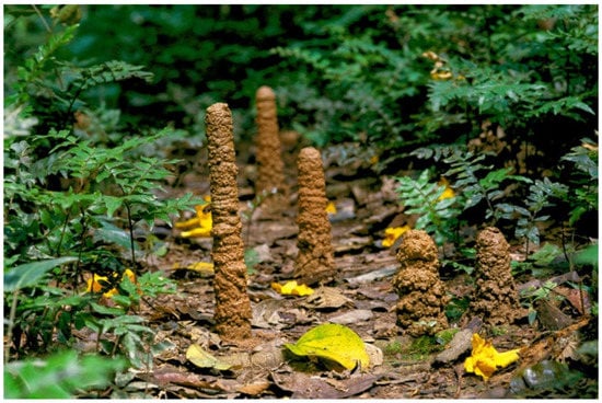Cicada nymphal stages live in cryptobiotic micro-habitats in the soil, feeding on xylem fluids from roots [167]. The four MTs of cicadas’ pre-imaginal instars can be divided into five sections: a thin anterior-most segment underlying the filter chamber, a short intermediate duct, a short, swollen, smooth proximal tract, a long, nodulose distal segment, and a thin terminal tract that ends in the rectum [89]. The proximal tract of the MTs is composed of large secretory cells producing granules of an acid mucopolysaccharide, while the distal segment displays cells with extensively developed rough endoplasmic reticulum and secretory vacuoles, producing a substance rich in proteins and carbohydrates [89]. As first observed by Fabre [86] in the cicada Tibicen plebeius Scopoli, 1763 (now Lyristes plebejus (Scopoli, 1763)), both the secretory products of the MTs mix with the copious watery excretion coming from the anus to create a fluid with mechanical and physiological properties. The proteinaceous component of the fluid is useful to agglutinate the soil particles and build the inner walls of their underground hallways and chambers and the aboveground “turrets” of exit (Figure 6) [86,87]. The fluid is also used to remove mud from legs and integument [87], buffer soil pH [88], and it is supposed to be fungicidal and fungistatic [89].