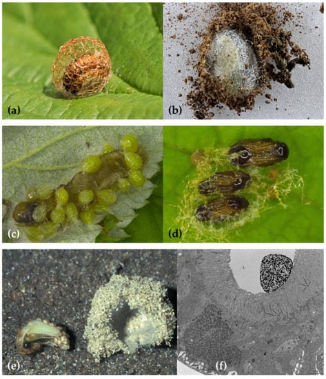 The Lepidoptera Erebidae Leucoma spp. and Lasiocampidae Eriogaster spp. and Malacosoma spp. build large, egg-shaped cocoons (Figure 7), from which the vulgar name “eggar moths” derives. The cocoons are very hard and from pale yellow to dark brown in color. They are made of silk produced by the labial glands, woven in a loose and open framework. The hardness is conferred by a paste of calcium produced by the larvae MTs [115,116] and incorporated (more or less evenly according to the species) around the silk threads [119]. For example, the main component of the crystalline powder covering the cocoon of Malacosoma neustria Linnaeus, 1758 is calcium oxalate monohydrate deriving from the oxalic acid in the diet [118], and the lemon-yellow pigment is assumed to be saturated after the crystallization inside the MTs lumen [117]. Some microscopic (TEM, SEM) observations, X-ray crystallography, and chemical, analytical, and spectroscopic analyses should be applied to the cocoons of such Erebidae and Lasiocampidae moths and other closely related species to verify their structure and the forms of calcium salts they include as well as their potential origin from the diet.