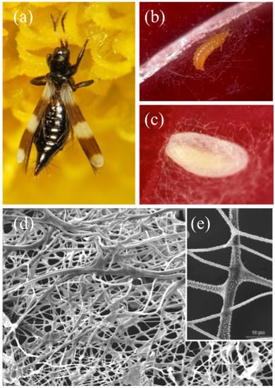 - Weisman, S.; Trueman, H.E.; Mudie, S.T.; Church, J.S.; Sutherland, T.D.; Haritos, V.S. An unlikely silk: The composite material of Green Lacewing cocoons. Biomacromolecules 2008, 9, 3065–3069. [Google Scholar] [CrossRef]