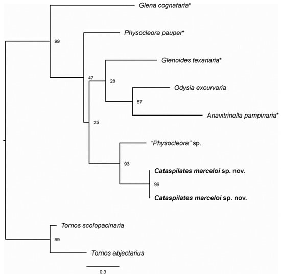 Maximum likelihood tree of Cataspilates marceloi sp. nov. (bold) and close Neotropical genera of Boarmiini based on mitochondrial DNA sequences. The asterisk indicates type species of the respective genus. Numbers indicate UFBoot2 support values (1000 replicates).