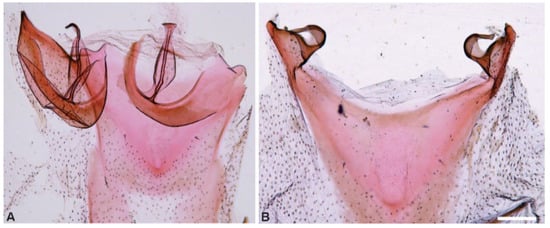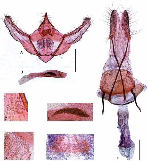 Female genitalia (Figure 4F,G). Papillae anales membranous, narrow, elongated, with setae. Apophyses posteriores rod-shaped, about twice the length of papillae anales. Apophyses anteriores rod-shaped, about one third the length of apophyses posteriores, with strong curvature near base. Lamella antevaginalis a narrow, slightly curved transverse rod, with flat expanded tips. Lamella postvaginalis a flat longitudinal stripe similar in length to apophyses anteriores, anterior half parallel-sided, posterior half with posteriorly convergent margins. Antrum membranous, about half the length of lamella postvaginalis. Ductus bursae about 1.5 times the length of apophyses anteriores, slightly sclerotized, longitudinally striated. Corpus bursae spherical, membranous, slightly wider than ductus bursae, with ellipsoidal signum with dentate anterior margin. Ductus seminalis arising from the middle of ductus bursae.