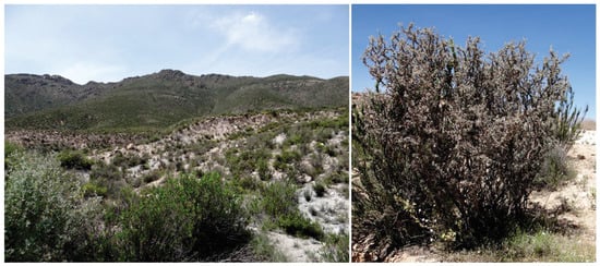 The type locality near Murmuntani village (left) and host plant Adesmia spinosissima (Fabaceae) (right) of Cataspilates marceloi sp. nov. in the Andes of northern Chile.