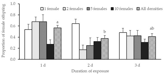 Proportion of G. aetherium female offspring ± SE produced at different female densities after 1, 2, or 3 d of exposure to B. hilaris eggs. Bars with different letters are significantly different (Tukey’s HSD, p < 0.05).