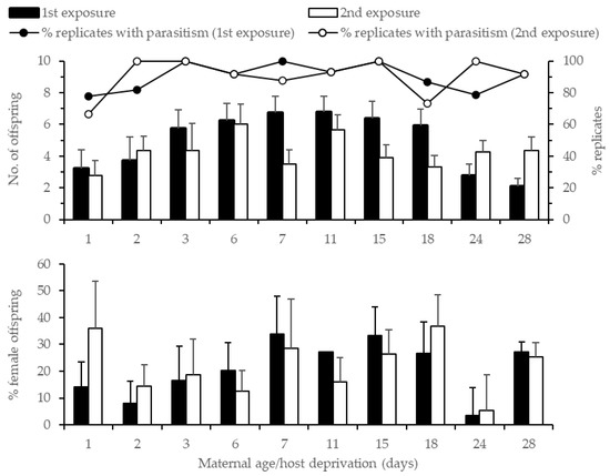 Percent replicates with parasitism, average number of offspring produced (top), and offspring sex ratio (bottom) ± SE of host-deprived G. aetherium females when exposed to 20 B. hilaris eggs for 3 h and 2 d consecutively.