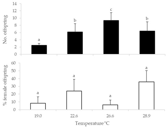 Progeny production (top) and sex ratio (bottom) of G. aetherium exposed at different temperatures during oviposition. Bars with different letters are significantly different (Tukey’s HSD, p < 0.05).