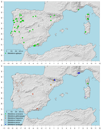 Capture locations of the species are indicated in Figure 2. Each location was positioned on the map as accurately as possible, based on the information available. In two cases (Alfaz del Pi and Elguera, both in Spain) that lacked latitude and longitude data, the symbol in Figure 2 is shown in the centre of the corresponding locality/location which might not necessarily correspond exactly with the actual collecting site.