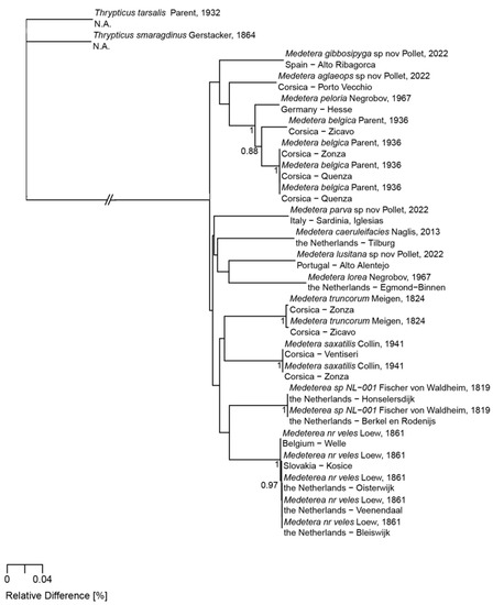 - Pollet, M.; Germann, C.; Bernasconi, M.V. Phylogenetic analyses using molecular markers reveal ecological lineages in Medetera (Diptera: Dolichopodidae). Can. Entomol. 2011, 143, 662–673. [Google Scholar] [CrossRef]
