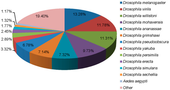 BLASTX alignments between the predicted unigenes and protein databases, including NR, NT, Swiss-Prot, KEGG, COG, and GO, revealed that 28,358 (56.41%) could be annotated with the known biological functions (Table S3). The majority of unigenes (79.09%) had a strong homology with Drosophila (Figure 1). Among these, 13.28% were best matched to the sequences from Drosophila melanogaster, followed by Drosophila virilis (11.78%) and Drosophila willistoni (11.31%). Other unigenes (20.91%) also had hits with other insect species, such as Tribolium castaneum (0.81%) and Bombyx mori (0.17%). Compared to species within Diptera, 1.17% of the unigenes matched sequences from Aedes aegypti, 0.20% from Glossina morsitans morsitans, and 0.14% from Musca domestica.