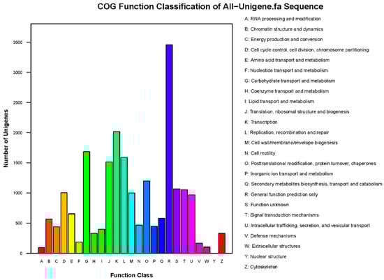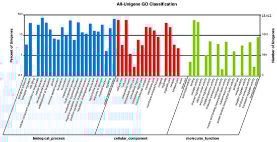 To classify the functions of the unigenes, the COG database was used. As shown in Figure 2, a total of 21,313 unigenes (42.40%) were annotated and divided into 26 specific categories. The general function category, which contained 16.23% of the mapped unigenes (3459), was the top category, followed by the transcription (2017, 9.46%), carbohydrate transport and metabolism (1683, 7.90%), replication, recombination, and repair (1586, 7.44%), and translation, ribosomal structure, and biogenesis (1515, 7.11%). The nuclear structure was the smallest category, which only contained two unigenes (0.0094%). GO analysis divided the unigenes into three ontologies: molecular function, cellular component, and biological process. As shown in Figure 3, 32.65% (16,412 unigenes) of the unigenes were categorized into 59 groups. The cellular process was the group containing the most unigenes.