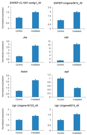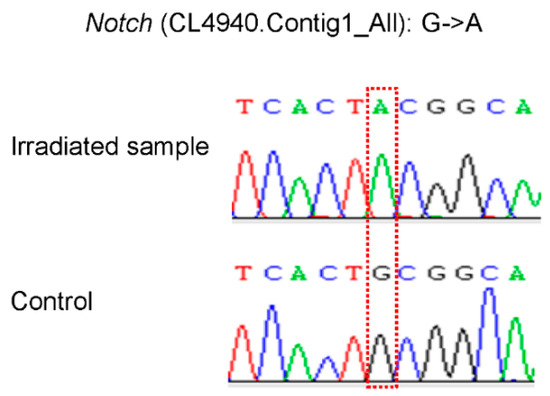 The differential expressions of eight unigenes were further confirmed by qRT-PCR. As shown in Table 4 (Figure 4), the squid gene sqd was downregulated in irradiated samples while ENPEP, Jhe, mth, Notch, and Ugt were highly expressed. The downregulation of sqd may contribute to the failure of emergence in irradiated samples since the initial organization of the Drosophila dorsoventral axis depends on the proteins encoded by sqd. Both ENPEP and Ugt are involved in metabolic pathways, and their up-regulation may be considered the results of the γ irradiation stress reaction. Juvenile hormone esterase (Jhe) plays an important role in the regulation of the juvenile hormone (JH). In lepidopteran hemolymph, decreased JH titers are positively correlated with increased JHE abundance [45]. The high expression of Jhe here may result in the low titers of JH, which are associated with diapause. For example, Monarch adult diapause is instituted by a deficiency in JH production [46]. Therefore, the upregulation of Jhe may contribute to the diapauses of our γ irradiated samples. Individuals with a mutated mth displayed an approximately 35 percent increase in their average lifespan and showed significant resistance to oxidative stress, starvation, and heat stress. We also detected a heterozygous SNP in this gene in the γ irradiated samples, which might be caused by the stress response. Notch (N) signaling is involved in establishing the correct width of various wing veins [47], and the up-regulation of Notch here may also contribute to the failure of emergence in the irradiated samples since the gain of function in Notch showed thinner and incomplete wing veins. In addition to the confirmed up-regulation of Notch, an SNP in this gene was also validated by the Sanger sequencing. It is highly possible that the confirmed SNP was induced by the irradiation treatment. Since the SNP was validated six times in three biological and three technical replicates of the samples, it could be used as DNA markers in quarantine. Other SNPs identified in this study are also useful sources for further studies on selecting DNA markers in quarantine.