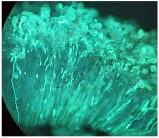 Pollen–pistil interaction was also analyzed in the triploid cultivar. For this purpose, the styles and stigmas were collected from 3 flowers in each cage and repeated on 3 non-consecutive days throughout the flowering period of both years, for a total of 216 flowers, 108 per year. Flowers were randomly tagged and collected 48 h after anthesis. The flowers were then preserved in FAA (formalin, glacial acetic acid, and 70% alcohol, in a 1:2:17 v/v ratio) before analysis under epifluorescence microscopy (Nikon E600, ×20) after staining them with aniline blue [42] to quantify pollen adhesion on the stigma (Figure 1).