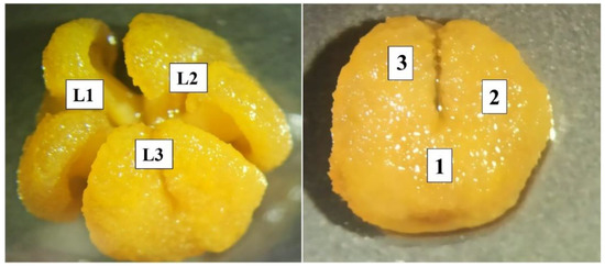 The three stigmatic lobes (L1, L2 and L3) of the watermelon flower (left) and the sampling areas in each lobe (1, 2 and 3 points) of the watermelon flower (right).