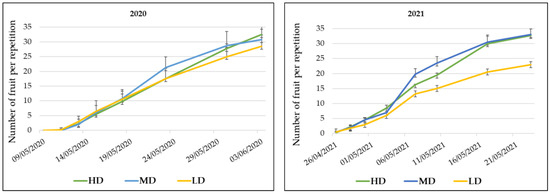 The first fruit setting was observed one week after syrphids release; that is, approximately four days after adult emergence. Although a good fruit set was observed for LD, the highest number of fruits was recorded for HD and MD treatments, with remarkable differences with respect to LD in 2021 (Figure 4).