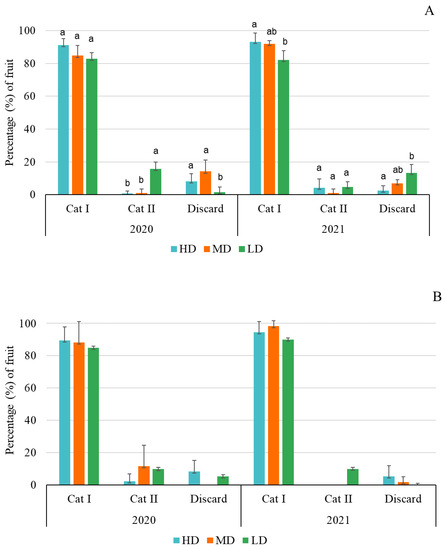 Percentage of triploid (A) and diploid (B) fruits according to quality categories and release density treatments (HD, MD, and LD). Different letters in each category for both cultivars indicate significant differences. (Tukey’s test, p < 0.05).