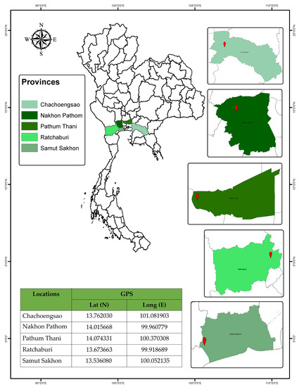 Recently, the Department of Agriculture (DOA) Thailand reported that the coconut mite, A. guerreronis, has been discovered in 18 provinces of Thailand, including Amnat Charoen, Chainat, Suphanburi, Kamphaeng Phet, Lop Buri, Nakhon Pathom, Nakhon Sawan, Nakhon Ratchasima, Pathum Thani, Phetchabun, Phichit, Phitsanulok, Ratchaburi, Saraburi, Sing Buri, Suphanburi, and Amnat Charoen; additionally, 4.2% of all the trees that were surveyed had fruit damage. The important coconut-growing regions of Thailand’s upper north, northeast, and south did not have this species. The results of this study reveal that A. guerreronis is also present in two provinces, Chachoengsao and Samut Sakhon, in addition to Nakhon Pathom, Pathum Thani, and Ratchaburi.