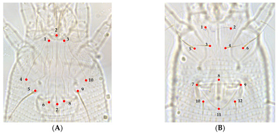 Morphological landmarks selected from prodorsal shield and coxigenital region of A. guerreronis according to [24,25]: (A) prodorsal shield, (1) left base of frontal lobe, (2) anterior central tip of front lobe, (3) right base of frontal lobe, (4) extremity of left lateral line on shield posterior margin, (5) base of left scapular seta (sc), (6) extremity of left admedian line on shield posterior margin, (7) extremity of median line on shield posterior margin, (8) extremity of right admedian line on shield posterior margin, (9) base of right scapular seta (sc), (10) extremity of right lateral line on shield posterior margin; (B) coxigenital region, (1) base of left coxal seta I (lb), (2) base of right coxal seta I (lb), (3) base of left coxal seta II (la), (4) base of right coxal seta II (la), (5) base of left coxal seta III (2a), (6) base of right coxal seta III (2a), (7) left joint of the anterior portion of genital seta (3a) tubercle with the anterolateral margin of coverflap, (8) projection of anterocentral tip of coverflap, (9) right joint of the anterior portion of genital seta (3a) tubercle with the anterolateral margin of coverflap, (10) base of left genital seta (3a), (11) posterocentral tip of epigynium, (12) base of right genital seta (3a).