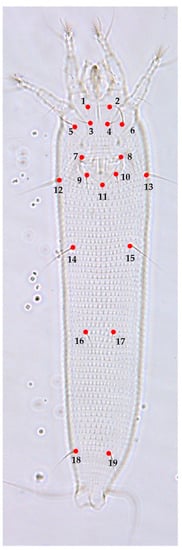 Morphological landmark selected from the ventral region according to [24,25]: ventral region, (1) base of left coxal seta I (lb), (2) base of right coxal seta I (lb), (3) base of left coxal seta II (la), (4) base of right coxal seta II (la), (5) base of left coxal seta III (2a), (6) base of right coxal seta III (2a), (7) left joint of the anterior portion of genital seta (3a) tubercle with the anterolateral margin of coverflap, (8) right joint of the anterior portion of genital seta (3a) tubercle with the anterolateral margin of coverflap, (9) base of left genital seta (3a), (10) base of right genital seta (3a), (11) posterocentral tip of coverflap, (12) base of left lateral seta (c2), (13) base of right lateral seta (c2), (14) base of left ventral seta I (d), (15) base of right ventral seta I (d), (16) base of left ventral seta II (e), (17) base of right ventral seta II (e), (18) base of left ventral seta III (f), (19) base of right ventral seta III (f).
