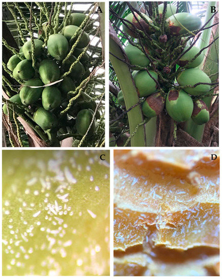 The invasive coconut mite Aceria guerreronis Keifer (Acari: Eriophyidae) has spread and become well established in the main coconut (Cocos nucifera L. (Arecaceae))-growing regions [1,2,3]. Keifer described the coconut mite in 1965 [4] based on samples gathered in the Mexican state of Guerrero. Coconut mite outbreaks typically occur during the dry season, which causes considerable financial losses for coconut producers [2,5]. Coconut mite colonies are concealed underneath the bracts of the fruits, where they feed on the meristematic tissue, which leads to surface scars, deformation, premature fruit drop, and reduced size, weight, albumen, water content, and yield [1,2,6,7]. Up to 60% of the crop can be lost when coconut mites are present [8], and a reduction in the copra yield or even the premature dropping of fruits can also occur [9,10]. Additionally, due to obvious necrosis brought on by this pest, the price of coconuts intended for the fresh market has been remarkably lowered [2,5].