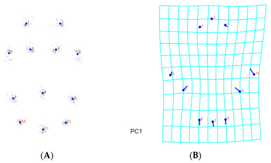 - Klingenberg, C.P. MorphoJ: An integrated software package for geometric morphometrics. Mol. Ecol. Resour. 2011, 11, 353–357. [Google Scholar] [CrossRef]