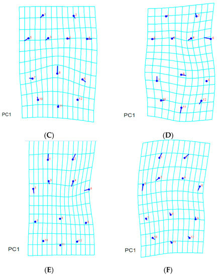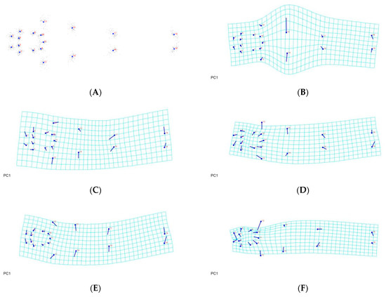 Thin-plate spline visualization of coxigenital area: (A) consensus, (B) Chachoengsao (C), (C) Nakhon Pathom (N), (D) Pathum Thani (P), (E) Ratchaburi (R), (F) Samut Sakhon (S).