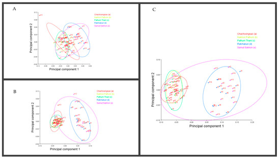 Principal component analysis of Thailand populations of A. guerreronis. Individuals plotted against their values for the first two principal components. Letters represent collection sites specified in Table 1: (A) ventral region, (B) coxigenital, and (C) prodorsal shield.