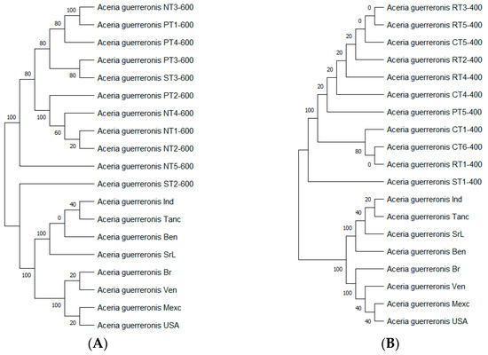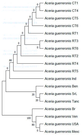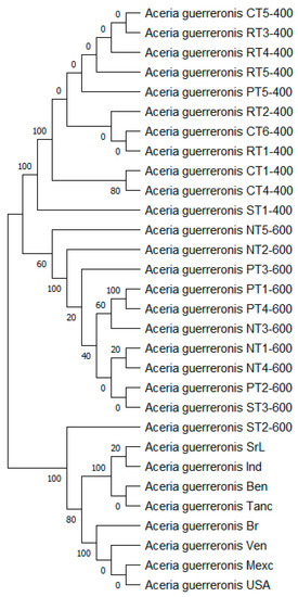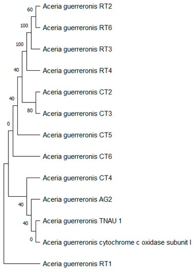 DNA sequences were manually checked using BioEdit [33] and then aligned using the ClustalW algorithm in MEGA 11.0 [34]. All the mtDNA16S sequences were aligned and trimmed to 400 and 600 bp, corresponding to the nucleotide positions (nps) 1–600 of the coconut mite (A. guerreronis) reference sequence DQ063558.1(USA), DQ063570.1(SrL), DQ063575.1(Ind), DQ063553.1(Br), DQ063564.1(Ben), DQ063562.1(Tanc), DQ063561.1(Ven), and DQ063560.1(Mexc). All the rDNA ITS sequences were aligned and trimmed to 987 bp, corresponding to the nucleotide positions (nps) 1–987 of the coconut mite (A. guerreronis) reference sequence DQ060624.1(Br), DQ060623.1(Ind), DQ060618.1(SrL), DQ060599.1(Tanc), DQ060597.1(Ben), DQ060582.1(Ven), DQ060580.1(USA), and DQ060576.1(Mexc). All the mtDNA COI sequences and trimmed to 494 bp, corresponding to the nucleotide positions (nps) 1–494 of the coconut mite (A. guerreronis) reference sequence MT253711.1, MT019905.1, and JX289538.1. The evolutionary history of the genomic DNA and mtDNA was inferred by using the maximum likelihood method, the Tamura 3-parameter model [35], and the Kimura 2-parameter model [36]. Initial trees for the heuristic search were obtained automatically by applying the Neighbor-Join and BioNJ algorithms to a matrix of pairwise distances, which were estimated using the Tamura 3-parameter model. The topology was then selected using the superior log likelihood value. Evolutionary analyses were conducted in MEGA11 [34].