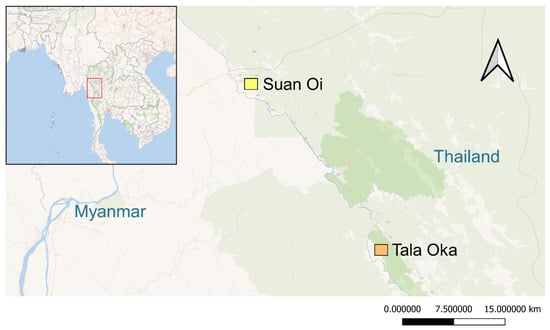 The study sites comprised two villages—Suan Oi (SO, 17°56′ N, 97°91′ E) and Tala Oka (TO, 17°33′ N, 98°10′ E) in Tha Song Yang District, Tak Province, western Thailand, on the Thai–Myanmar border, a malaria hotspot area divided by the Moei River (Figure 1). At the time of our work, there were 596 and 1,218 residents in SO and TO, respectively. About 50 water sources were found in the two villages and located near households. Records provided by the Bureau of Vector-Borne Diseases showed malaria incidences of 441 cases in 2021, most of which were caused by P. vivax []. In addition, 42 dengue cases were reported in Tha Song Yang District []. Malaria incidence occurs all year round and peaks after the wet season. The primary malaria vectors in this area are An. minimus, An. maculatus and An. dirus []. According to Thailand’s vector control policy, indoor residual spraying is conducted twice a year. Pyrethroid-treated bed nets (deltamethrin and permethrin) were distributed to local residents for malaria control. The larvicide temephos, sand granules, and fogging with deltamethrin were used to control dengue transmission.
