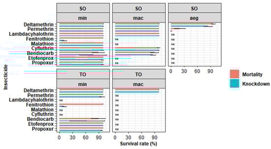 Mortality and knockdown rate assessed following the WHO guidelines for insecticide monitoring in An. minimus s.l. (min), An. maculatus s.l. (mac), and Ae. aegypti (aeg) from Suan Oi (SO) and Tala Oka (TO) villages. Error bars represent standard error; na represents no data values.