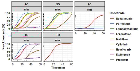 A total of 5764 female mosquitoes were obtained from two villages—Suan Oi (SO) and Tala Oka (TO) in Tha Song Yang District—and tested in this study. Among these, 5339 (92.63%) were wild-type Anopheles spp. and 425 (7.37%) were F1 Ae. aegypti (from about 200 parents). The mortality and knockdown (KD) time for An. minimus s.l., An. maculatus s.l., and Ae. aegypti in Suan Oi (SO) are shown in Table 1, and the corresponding data for An. minimus s.l. and An. maculatus s.l. in Tala Oka (TO) are shown in Table 2. Figure 2 shows the mortality and knockdown rate in An. minimus s.l. (min), An. maculatus s.l. (mac) and Ae. aegypti (aeg) from both study sites. Anopheles minimus s.l. and An. maculatus s.l. in both sites were susceptible to most of the insecticides, with the mortality rate ranging between 98% and 100%, except for bendiocarb. Resistance to 0.1% bendiocarb was found in An. minimus s.l. at both sites and An. maculatus s.l. in SO, and the mortality rates were 88.80%, 88.77%, and 89.92%, respectively. The kinetic graphs of knockdown rates are presented in Figure 3. In F1 Ae. aegypti, suspected resistance to deltamethrin (mortality 96.89%) and resistance to permethrin (mortality 20%) was found. The KDT50 values for deltamethrin and permethrin were 41.09 and 144.33 min, respectively.