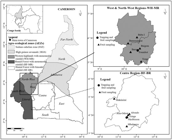 Fruit fly trapping and fruit sampling locations in Cameroon. Enlarged maps to the right correspond to the 2 agro-ecological zones—WH and HF-BR—targeted in this study.