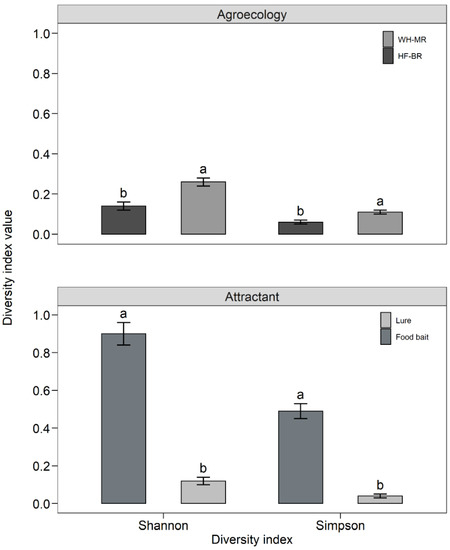 Shannon and Simpson indices (means ± SE) of fruit fly diversity according to agro-ecological zones and attractants. Means (vertical bars) followed by the same letter on each index are not significantly different (Kruskal–Wallis test, p < 0.05).
