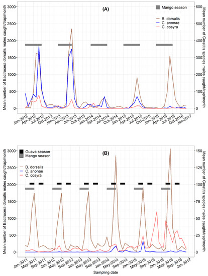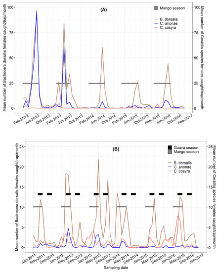 - Vayssières, J.-F.; De Meyer, M.; Ouagoussounon, I.; Sinzogan, A.; Adandonon, A.; Korie, S.; Wargui, R.; Anato, F.; Houngbo, H.; Didier, C.; et al. Seasonal abundance of mango fruit flies (Diptera: Tephritidae) and ecological implications for their management in mango and cashew orchards in Benin (Centre & North). J. Econ. Entomol. 2015, 108, 2213–2230. [Google Scholar] [CrossRef]