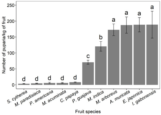 Mean infestation levels (mean number of puparia per kg of fruit ± SE) per fruit in HF-BR. Host fruit species followed by the same letter in the graph are not significantly different (GLM with Gaussian error, Tukey’s HSD, p < 0.05).