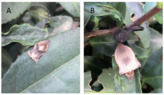Tea tortrix moths A. strojny were captured from a tea plantation in Xihu District in Hangzhou City, Zhejiang Province, China (30.17° N, 120.03° E) on 16 March 2020 (Figure 1). Male and female moths were separated into different cages (60 cm × 60 cm × 60 cm) and were reared in a 16:8 h light–dark cycle at 25 ± 1 °C and 60–70% relative humidity. To obtain offspring for the sustainability study, 30 pairs of male and female A. strojny moths were reared together in the same mesh cage, supplemented with 5% honey water.