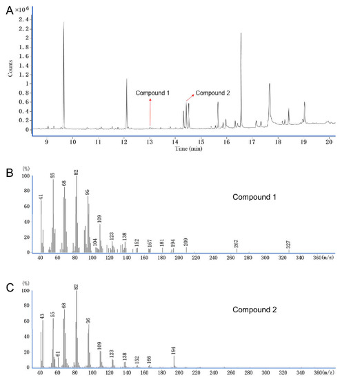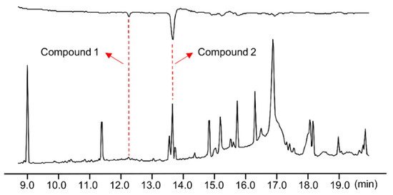 GC–EAD analysis of a crude A. strojny female gland extract revealed two bioactive compounds that elicited a male antennal response. As shown in Figure 2, the retention times (RTs) of these two bioactive compounds were 12.25 min (Compound 1) and 13.67 min (Compound 2). In terms of the relative amount, the GC chromatogram indicated that Compound 2 has a much higher relative abundance compared with Compound 1 in the crude pheromone gland extract. Therefore, Compound 2 was assumed to serve as the main sex pheromone component in A. strojny, while Compound 1 was a minor component.