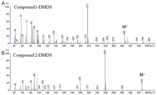 The GC–MS analysis of female crude extract treated with DMDS revealed that the adduct of Compound 1 exhibited M+ at 306 and diagnostic fragment ions at m/z 217 and 89 (Figure 4A), and the DMDS adduct of Compound 2 showed M+ at 348 and diagnostic fragment ions at m/z 259 and 89 (Figure 4B). The spectral information of the DMDS adducts indicated that the two thiomethyl groups (SCH3) are assumed to add the double bond at the same carbon 11 positions of both tetradecenyl alcohol and acetate [19,28,29].