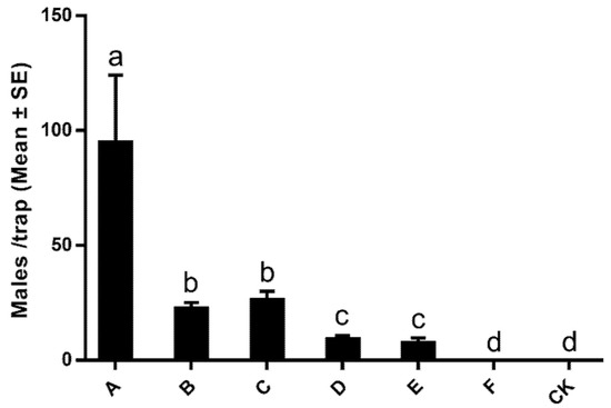 Numbers of Archips strojny male moths caught in traps baited with different ratios of synthetic sex pheromone components during a field trapping assay conducted at Longwu in Hangzhou City, Zhejiang Province, China (15 March 15–2 April 2021). A–F indicate different ratios of (Z)-11-tetradecenyl alcohol (Z11-14:OH) to (Z)-11-tetradecenyl acetate (Z11-14:Ac): (A) 0:100, (B) 5:95, (C) 10:90, (D) 20:80, (E) 40:60, and (F) 100: 0. CK indicates traps baited with only 100 µL of n-hexane. Four replicates were used for each ratio. Different letters above the bars indicate significant differences (p < 0.05, one-way ANOVA analysis followed by a Tukey’s post hoc test (F = 90.235; df = 6.21)).