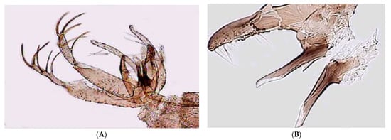 The male of Ph. perfiliewi is easily distinguished by the characteristic shape of the parameral sheath (=aedeagus or penis), which has a flattened transparent apex on the ventral side and bears 4 to 5 serrated denticles on the opposite side (Figure 2A,B).
