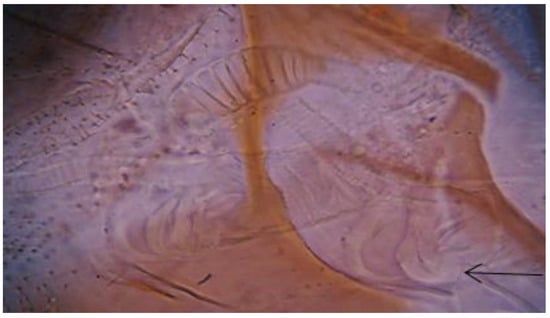 Photomicrograph of the female Ph. perfiliewi spermathecal duct (arrow indicates the large triangular wrinkled pocket).