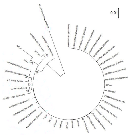 The Ph. perfiliewi sequences of the processed Tunisian specimens cluster with most of the Italian ones available in the GenBank (Figure 4), except 4F uti and 6M uti which are clearly themselves individualized mostly due to 3 bp transversions, and 21F sad shared its haplotype with the Sardinian MN385544 (1 nucleotide differing from the main haplotype). All the processed Ph. perfiliewi are well separated from Ph. perniciosus. The overall nucleotide divergence within all Ph. perfiliewi Cyt b sequences analyzed is just 1%.