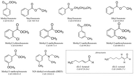 Methyl benzoate (MB), Methyl 2-chlorobenzoate (M2CB), Methyl 2-methylbenzoate (M2MB), Methyl 2-methoxybenzoate (M2MOB), Ethyl benzoate (EB), N,N-diethyl-meta-toluamide (DEET), Acetone (solvent), (E)-2-Hexenal, and (E)-2-Octenal were purchased from Sigma Aldrich (St. Louis, MO, USA). Methyl 3-methylbenzoate (M3MB), Methyl 3-methoxybenzoate (M3MOB), and Vinyl benzoate (VB) were purchased from Fisher Scientific (Waltham, MA, USA). Hexyl benzoate (HB) was purchased from Alfa Aesar (Ward Hill, MA, USA). Purity of all chemicals was ≥95%. Chemical structures and CAS registry numbers for all compounds are shown in Figure 1.