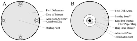 Figure 2. Diagrams showing the assays used in this study. (A) Four-disc assays (repellency longevity and repellency in presence of aggregation pheromone components). A 15 cm Petri dish was lined with filter paper, and four absorbent filter paper discs (one of which contained a repellent compound) were evenly spaced close to the perimeter of the arena. Trials began with a bed bug in the center of arena. * Attractant/acetone was present under the absorbent filter paper discs only in the second set of experiments (with aggregation pheromone components). (B) Repellent activity in presence of food source. A 15 cm Petri dish was lined with filter paper, and a centrifuge cap filled with human blood was placed in the center of the arena and surrounded by a ring of filter paper treated with a repellent compound. ** Starting zone was randomized, but always along the border of the arena.