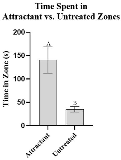 Figure 3. Repellent activity in presence of aggregation pheromone components, baseline results. Amount of time (mean +/− SEM) the subject spent in zone treated with attractant [equal parts by volume of (E)-2-hexenal and (E)-2-octenal, diluted 1:10,000 (0.01%) in acetone] compared to average of time spent in the three untreated zones. Different letters above them are significantly different at α = 0.05. t-test: n = 20, p = 0.0007.