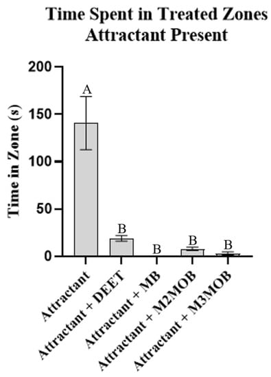 For tests run in the presence of aggregation pheromones, when only the aggregation mixture blend (attractant) was present around the filter paper disc, the subject spent more time near the treated filter paper disc than near the untreated filter paper discs (p = 0.0007), showing successful attractancy (Figure 3). When DEET, MB, M2MOB, or M3MOB were applied to the filter paper discs in addition to the attractant, the subject spent less time near the treated filter paper disc than when only the attractant was present (p < 0.0001 for all four compounds) (Figure 4).