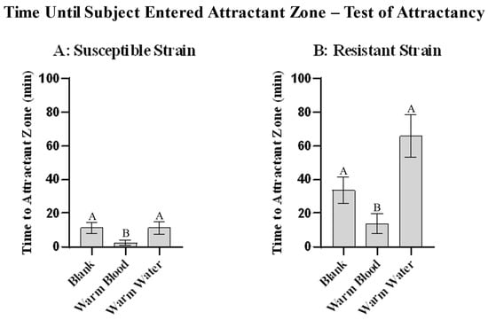 Figure 5. Repellent activity in presence of food source, baseline results. The amount of time (mean +/− SEM) it took for subjects in susceptible strain (A) and resistant strain (B) to enter the attractant zone, in minutes, when zone contained warmed blood, warmed water, or neither (blank). Different letters above them are significantly different at α = 0.05. A: ANOVA: n = 20 per treatment (n = 60 total), F(2, 57) = 6.573, p = 0.0027. Holm-Šidák’s multiple comparisons: Warm blood vs. blank, p = 0.0025; warm blood vs. warm water, p = 0.0322; blank vs. warm water, p = 0.2959. B: ANOVA: n = 20 per treatment (n = 60 total), F(2, 57) = 4.613, p = 0.0139. Holm-Šidák’s multiple comparisons: Warm blood vs. blank, p = 0.0451; warm blood vs. warm water, p = 0.0182; blank vs. warm water, p = 0.6135.